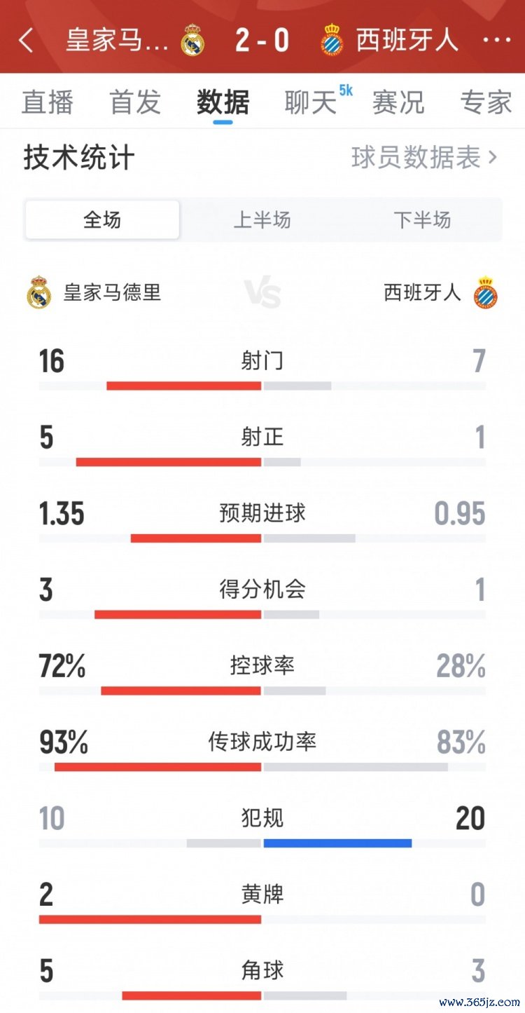 9月21日讯 在本轮西甲,皇马2-0击败西班牙人, 篮球新闻足球直播以下为双方全场数据对比:
