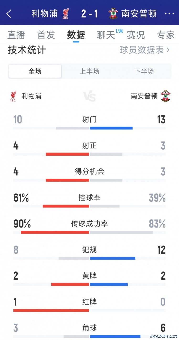 9月24日讯 在本轮职业联赛 杯, 篮球新闻高清直播利物浦2-1击败南安普顿。以下为双方本场数据对比: