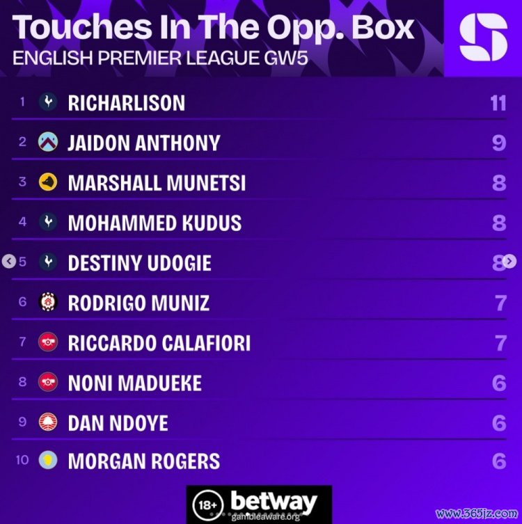 9月24日讯 英超第5轮战罢,squawkafootball列各项数据排行,搏击资讯体育赛事热刺前场球员理查利森是本轮在对方危险区域 触球最多的球员, 篮球新闻共11次。