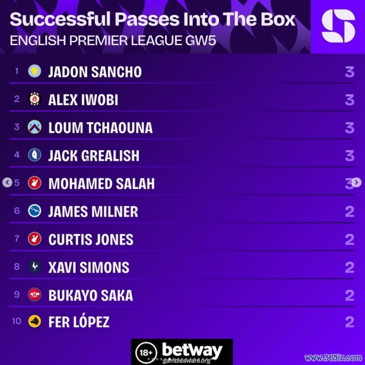 9月24日讯 英超第5轮战罢,squawkafootball列各项数据排行,搏击资讯直播平台桑乔等5名球员3次成功将球传入危险区域 , 篮球新闻为本轮职业联赛 最多。