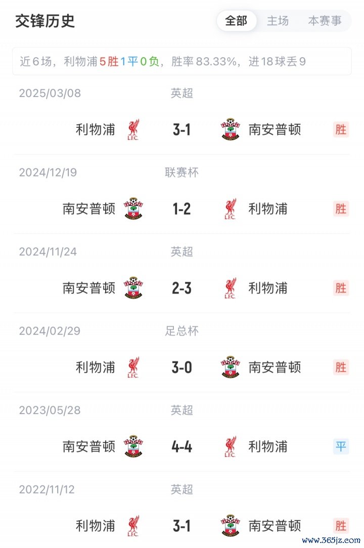 利物浦职业联赛 5战全胜积15分暂位英超榜首,搏击资讯目前各项赛事6连胜;南安普顿职业联赛 1胜3平2负积6分暂位英冠第19,近3轮职业联赛 不胜。利物浦各赛事对阵南安普顿已9场不败(8胜1平)。
