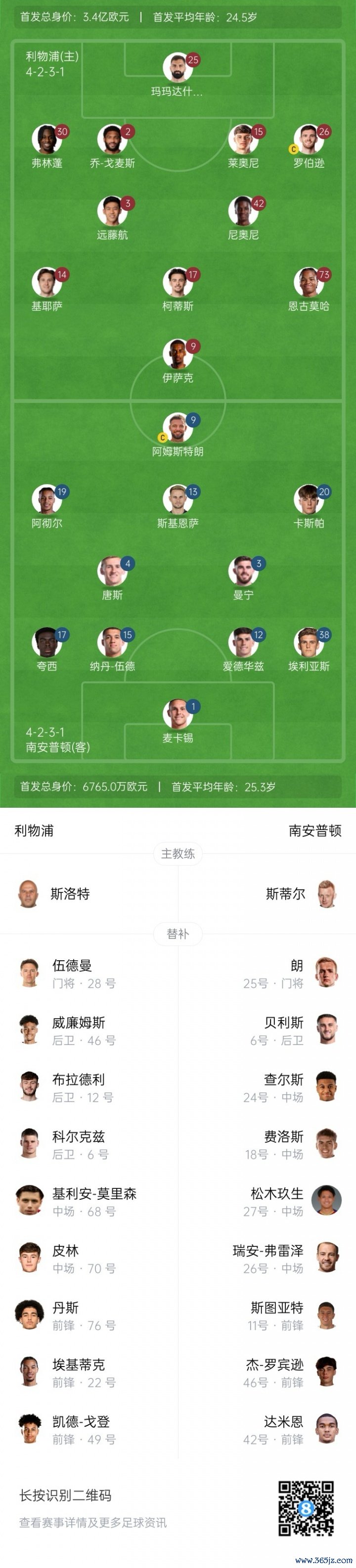 利物浦后备 :28-伍德曼、6-科尔克兹、12-布拉德利、46-里斯-威廉姆斯、68-基利安·莫里森、70-托米·皮林、22-埃基蒂克、49-凯德·戈登、76-杰登·丹斯
