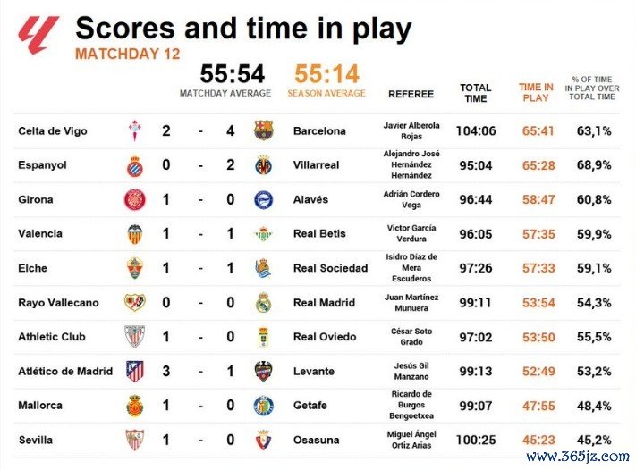 11月10日讯 数据网站OPTA盘点了本轮西甲有效时间榜单,其中巴萨4-2塞尔塔以及比利亚雷亚尔2-0西班牙人的两场赛事 有效时间超过65分钟。