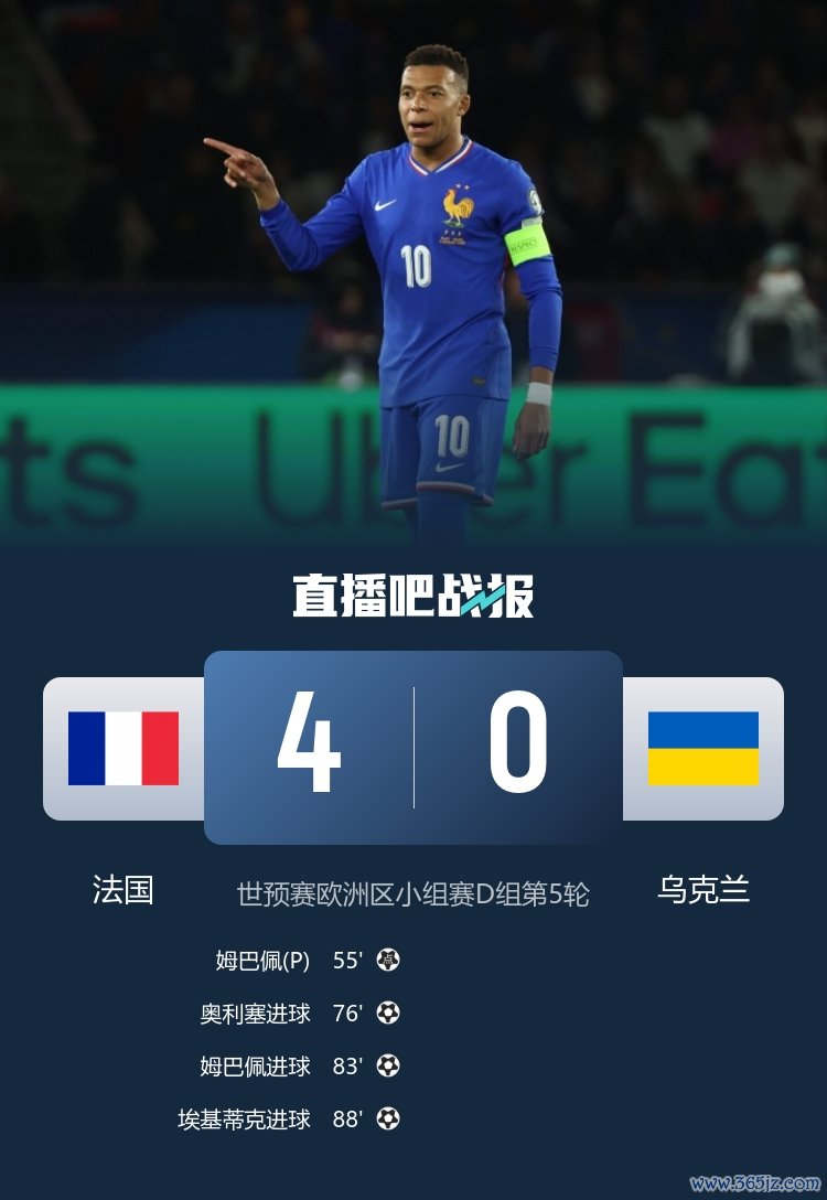世预赛欧洲区D组,法国4-0横扫乌克兰,姆巴佩双响并解锁生涯400球,法国队提前晋级下一轮 世界杯赛 !