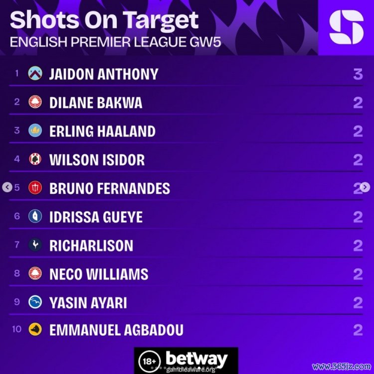 9月24日讯 英超第5轮战罢,squawkafootball列各项数据排行, 篮球新闻无插件直播伯恩利前场球员杰顿-安东尼是射正次数最多的球员, 欧冠共3次。