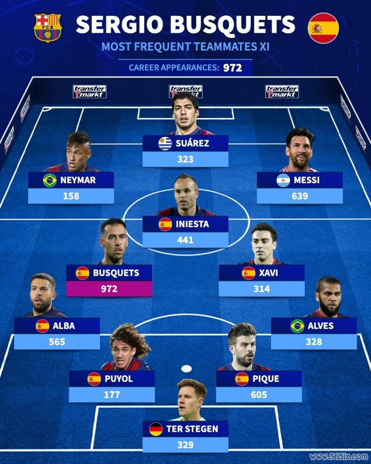 9月26日讯 西班牙中场球员布斯克茨今日宣布赛季结束后退役,德转评出在布斯克茨截止目前的职业生涯中,搏击资讯体育赛事最常搭档的11人阵形 。其中梅西639场居首, 篮球新闻皮克605场第二。布斯克斯本人目前职业生涯出场次数972场。