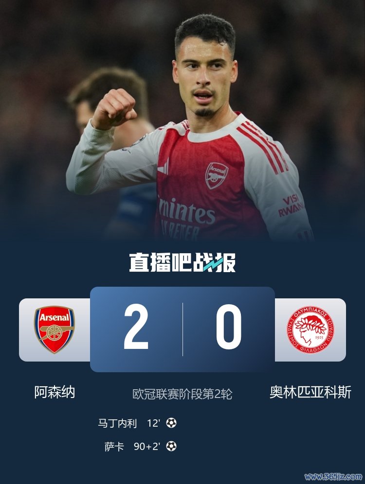 阿森纳本轮2-0击败奥林匹亚科斯,马丁内利、萨卡各入一球,小领队 厄德高表现出色。