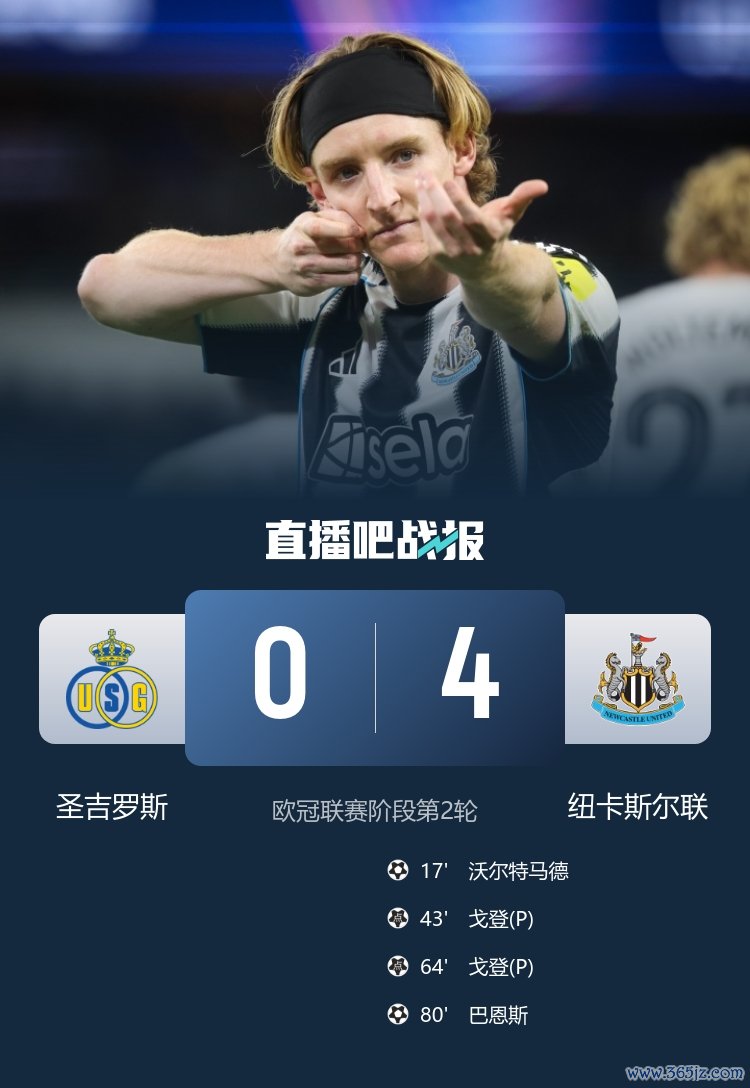 欧冠早场赛事,纽卡4-0横扫圣吉罗斯,搏击资讯戈登点射双响, 篮球新闻沃尔特马德、巴恩斯破门。