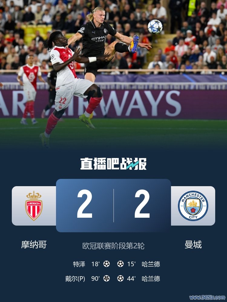 曼城2-2遭摩纳哥绝平,哈兰德打入两球,但曼城没能收获胜局。