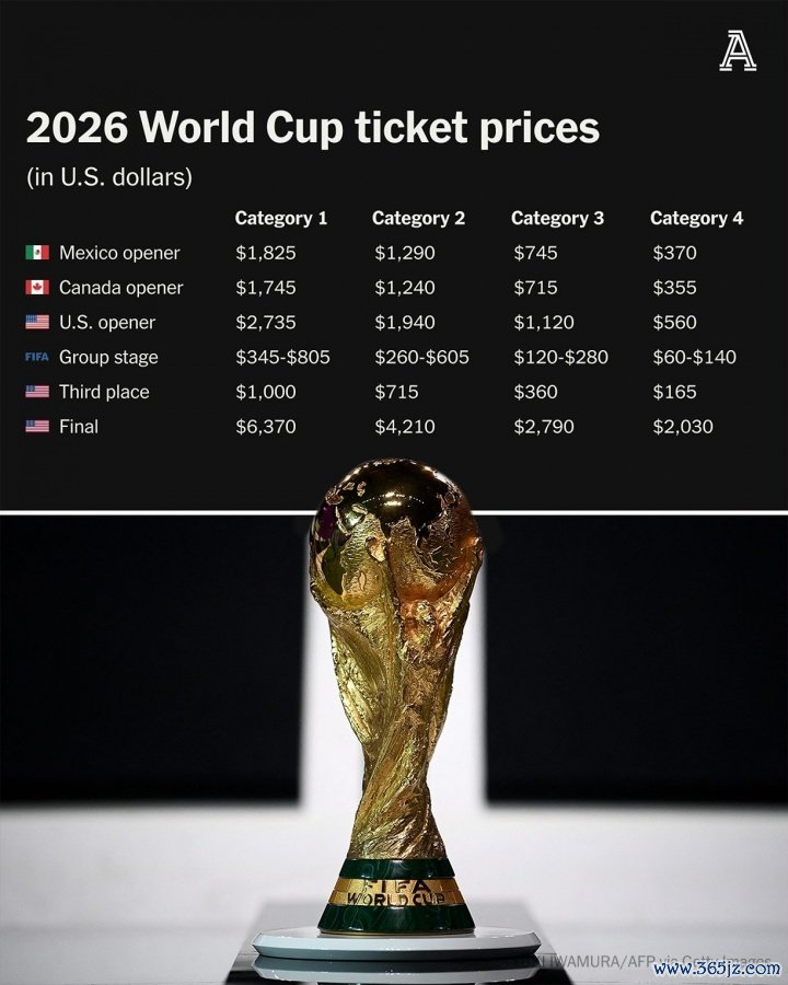 根据TA报道,搏击资讯明年世界杯赛 门票将分为4档, 篮球新闻五大联赛在墨西哥的首场赛事 门票价格为370美元、745美元、1290美元以及1825美元;在加拿大的首场赛事 门票价格为355美元、715美元、1240美元以及1745美元;在美国的首场赛事 门票价格为560美元、1120美元、1940美元以及2735美元。