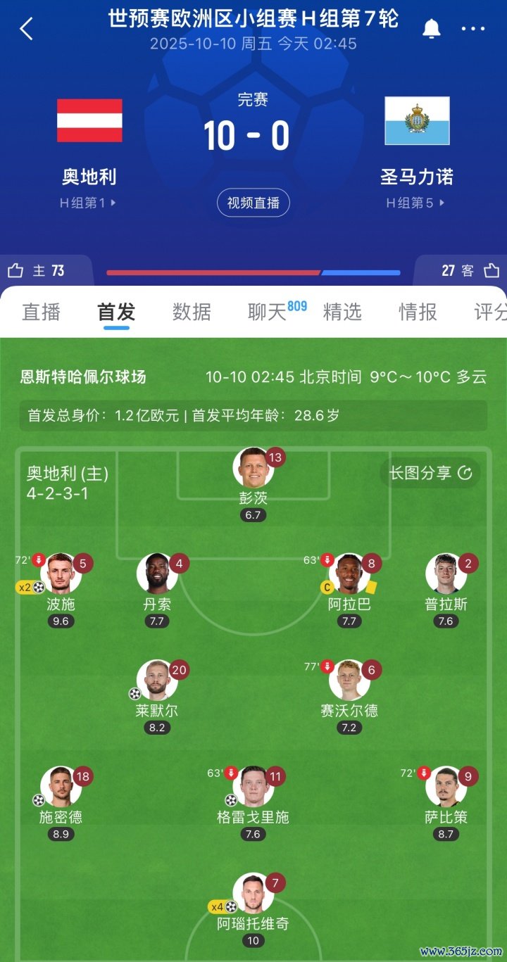 10月10日讯 世预赛欧洲区小组赛H组第7轮,奥地利10-0大胜圣马力诺, 欧冠法甲直播本场赛事 奥地利杆位11人除守门员外全部加入 得分 !奥地利FIFA排名第22,搏击资讯圣马力诺FIFA排名倒数第一。