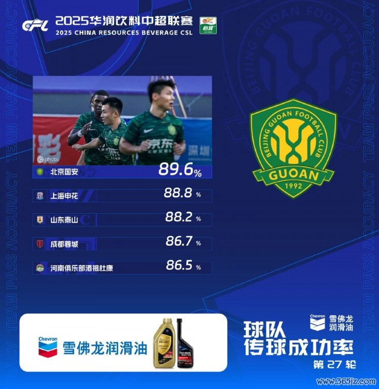 10月22日讯 中超职业联赛 官方公布了第27轮传送球 成功率排行榜,国安排名第一,搏击资讯直播平台申花、泰山分列二、三位。