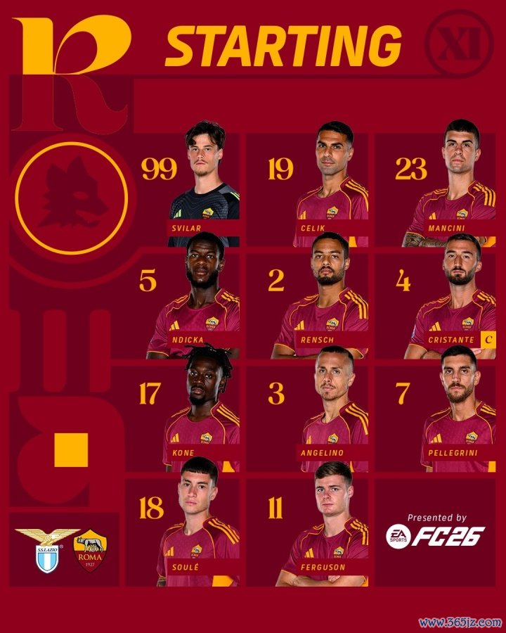 罗马杆位:99-斯维拉尔、19-切利克、23-曼奇尼、5-恩迪卡、2-伦施、3-安吉利诺、4-克里斯坦特、17-科内、7-佩莱格里尼、18-苏莱、11-埃文·弗格森