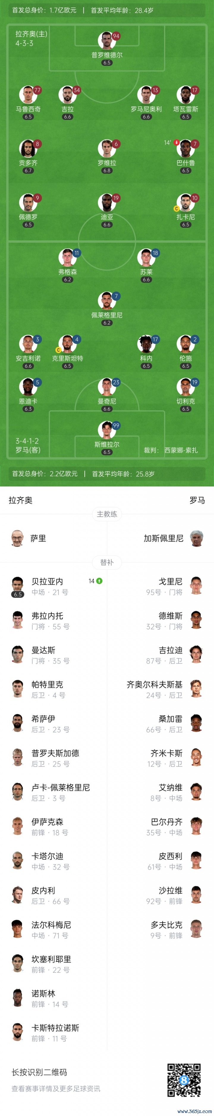 拉齐奥杆位:94-普罗维德尔、13-罗马尼奥利、17-努诺-塔瓦雷斯、34-吉拉、77-马鲁西奇、6-罗维拉、7-德勒巴什鲁、8-贡多齐、10-扎卡尼、9-佩德罗、19-布莱-迪亚