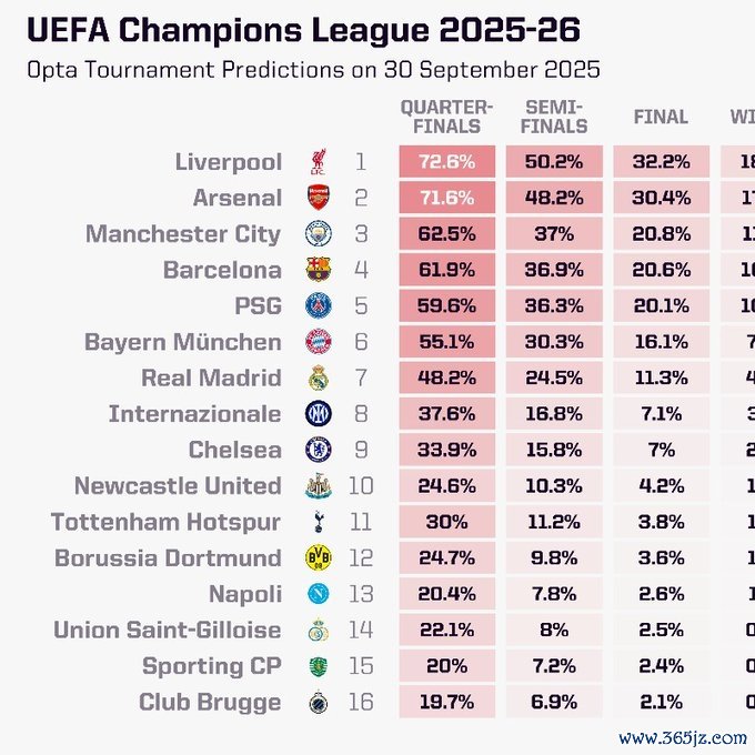 09月30日讯 欧冠职业联赛 阶段第二轮开赛在即,opta超级计算机更新了欧冠夺魁 概率, 篮球新闻高清直播其中利物浦位列榜首, 欧冠阿森纳、曼城分列二三。