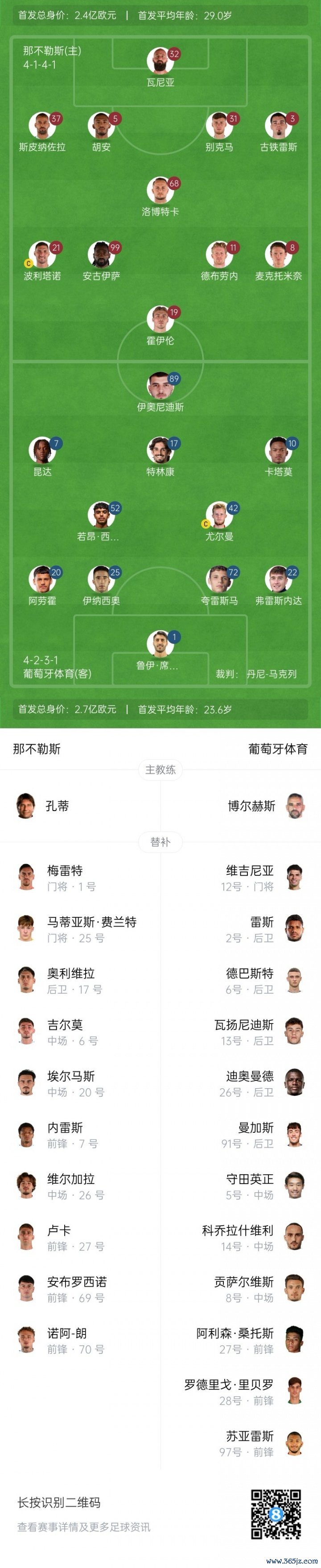 那不勒斯杆位:32-瓦尼亚、3-古铁雷斯、5-胡安、31-别克马、37-斯皮纳佐拉、8-麦克托米奈、11-德布劳内、68-洛博特卡、99-安古伊萨、19-霍伊伦、21-波利塔诺