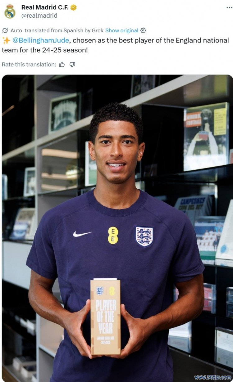 10月2日讯 贝林厄姆当选24/25赛季英格兰男子成年队年度最佳球员,皇马官推也晒照为其送上祝贺。