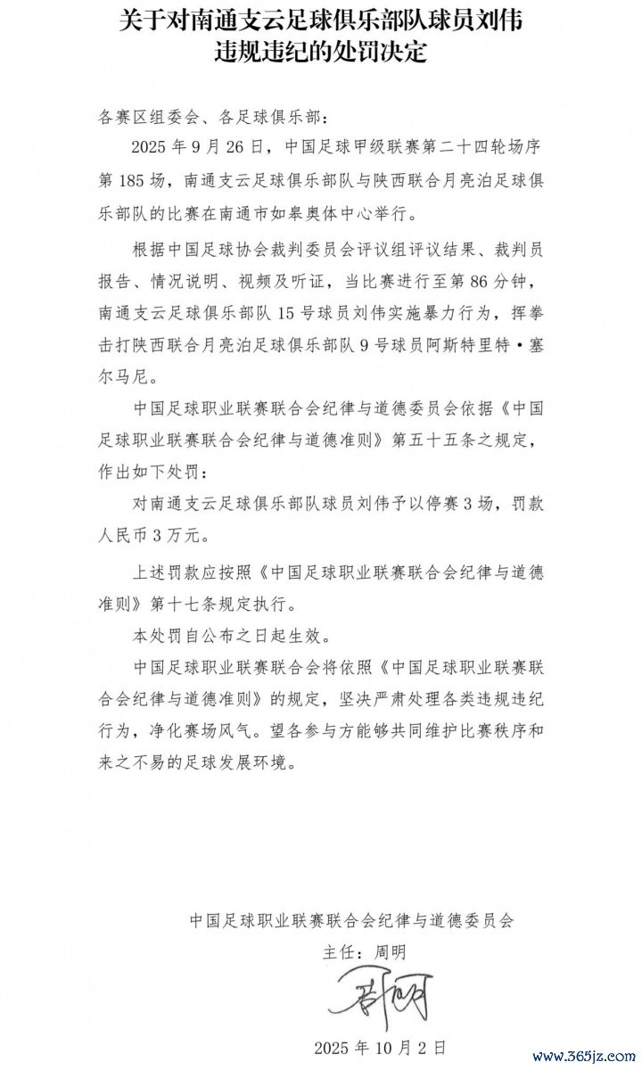 10月02日讯 中足联今天发布处罚决定,根据最新一期裁判 评议结果,决定对南通支云球员刘伟停赛3场,搏击资讯罚款3万元。