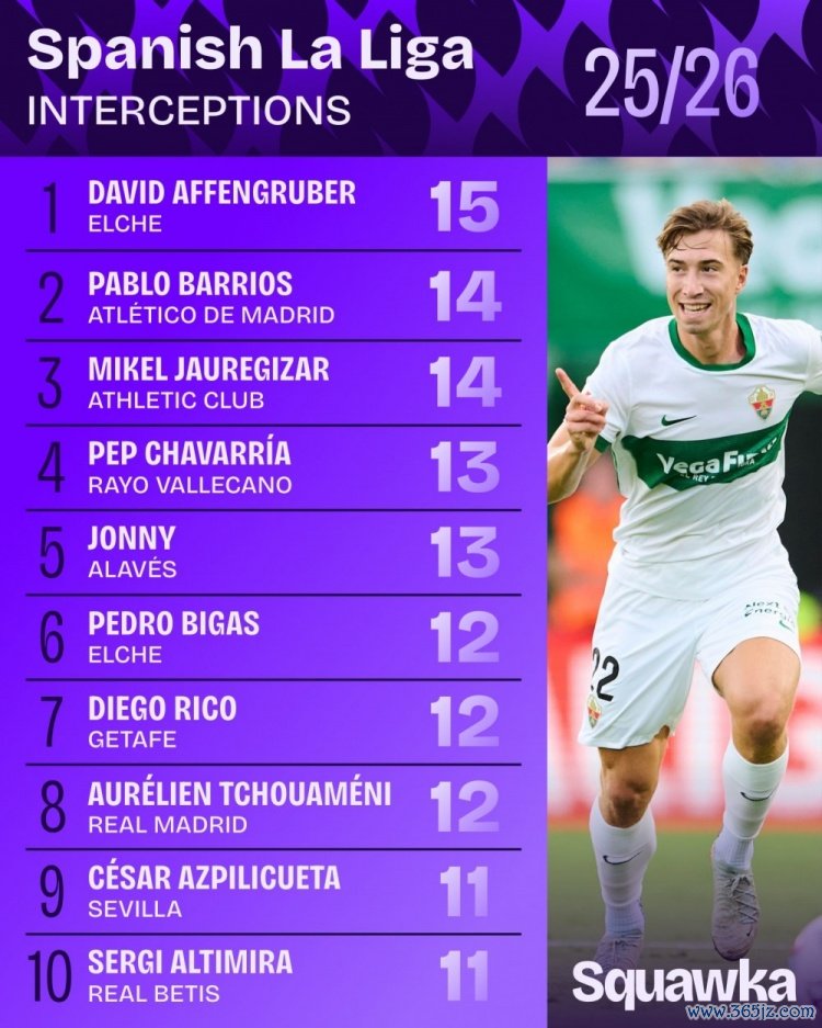 10月7日讯 日前,Squawka统计了本赛季西甲阻拦 次数排行, 篮球新闻法甲直播巴里奥斯14次并列第2, 欧冠琼阿梅尼12次并列第6。