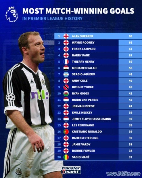 10月17日讯 德国转会市场盘点了英超历史打进制胜球排行情况,希勒以68球居首, 欧冠无插件直播鲁尼66球位居次席。