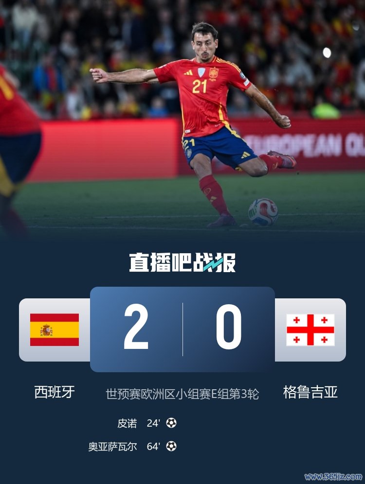 西班牙本轮2-0完胜格鲁吉亚,皮诺和奥亚萨瓦尔破门。
