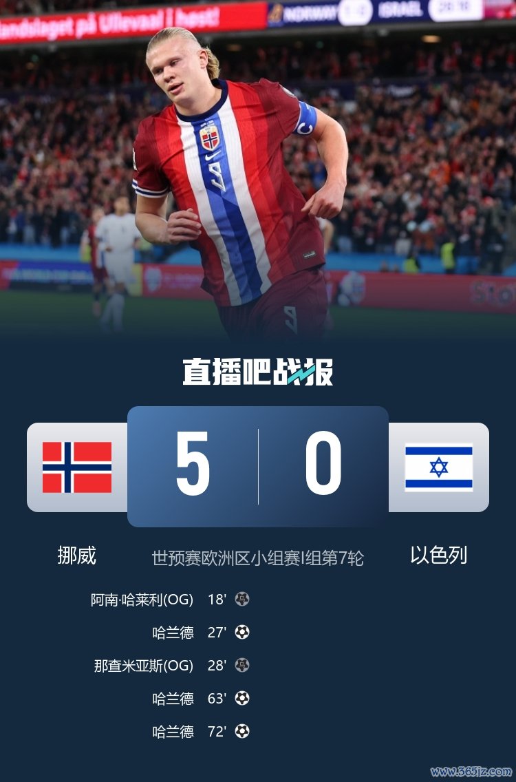 豪取六连胜!挪威5-0以色列先赛9分领跑 哈兰德戴帽+两度失点