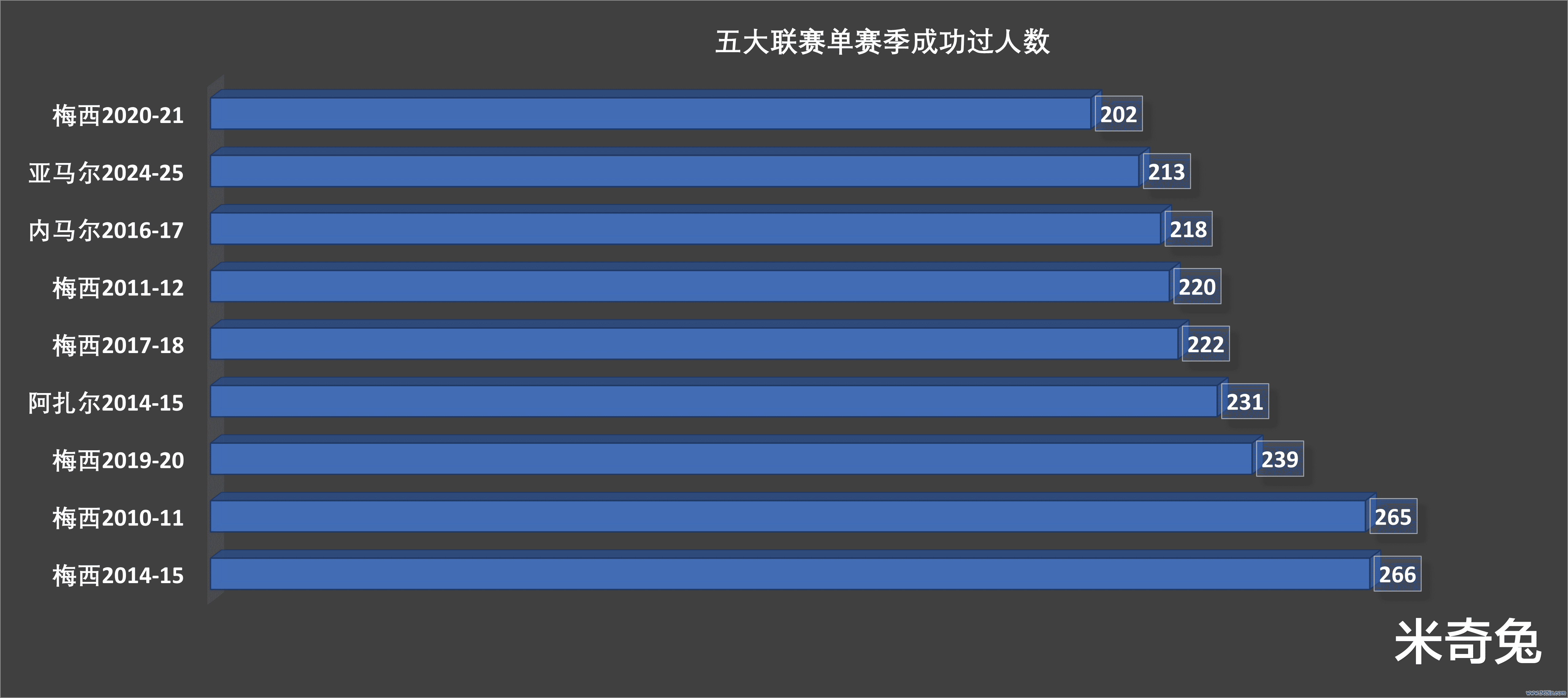 作为球王,梅西的控球能力是历史级的强大,五大职业联赛 历史上,单年出现一名球员成功过人破200次的只有9回,其中6次属于梅西,同时历史过人榜的单年数据里,第一第二第三名都是梅西。