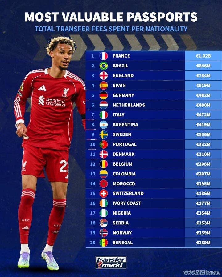虎扑09月09日讯根据德转提供德数据,尽管今夏前25大转会中,法国球员仅有1人入榜,但从整体来看,法国护照依旧是整个转会市场中最具价值的通行证。