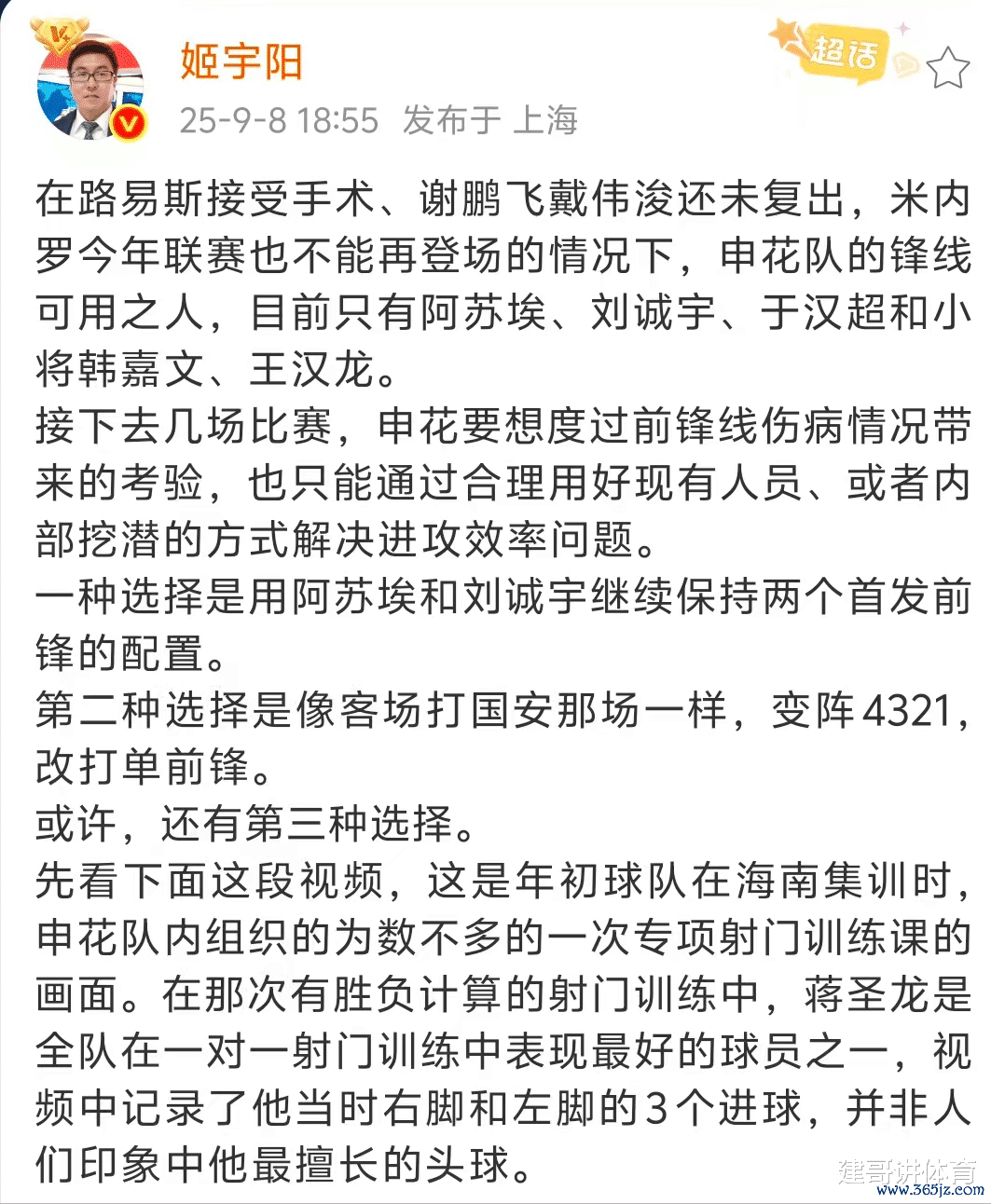 北京时间9月10日,在中超第24轮的焦点战上海申花主场作战 迎战山东泰山队的赛事 到来前,上轮意外输给武汉三镇的上海申花队足球彩票,则再次被媒体报道出疑似利好对手山东泰山队的消息,名记姬宇阳对上海申花队的现状也专门发文表达出了自己的观点,从姬宇阳的态度来看,他对申花迎战泰山队的赛事 还是多少有些担忧的。