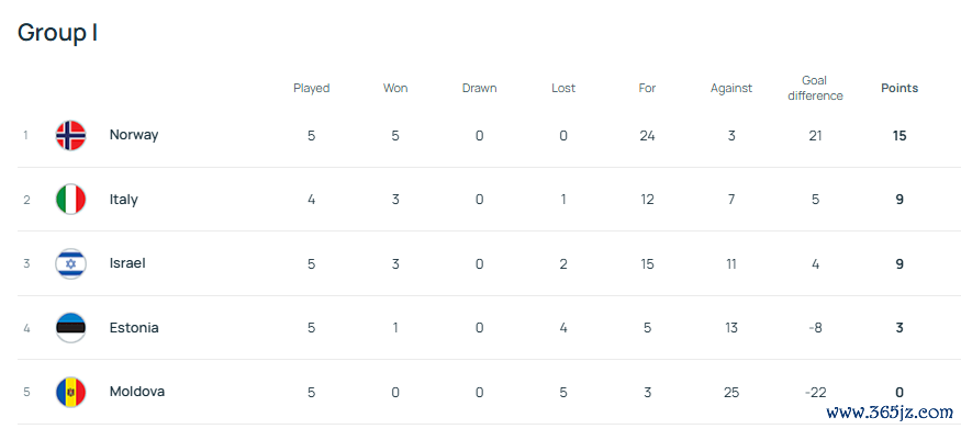 根据世预赛欧洲区积分规则,若出现同分的情况下,先比较净胜球,再对比总得分 数、相互战绩。目前,I组榜首挪威5战全胜积15分21个净胜球,小组第二的意大利4战拿9分5个净胜球。挪威还剩下3场小组赛,主场作战 对阵以色列、爱沙尼亚和客场应战 应战 意大利。意大利还要踢4场小组赛,搏击资讯主场作战 对阵以色列和挪威, 篮球新闻客场应战 应战 爱沙尼亚和摩尔多瓦。