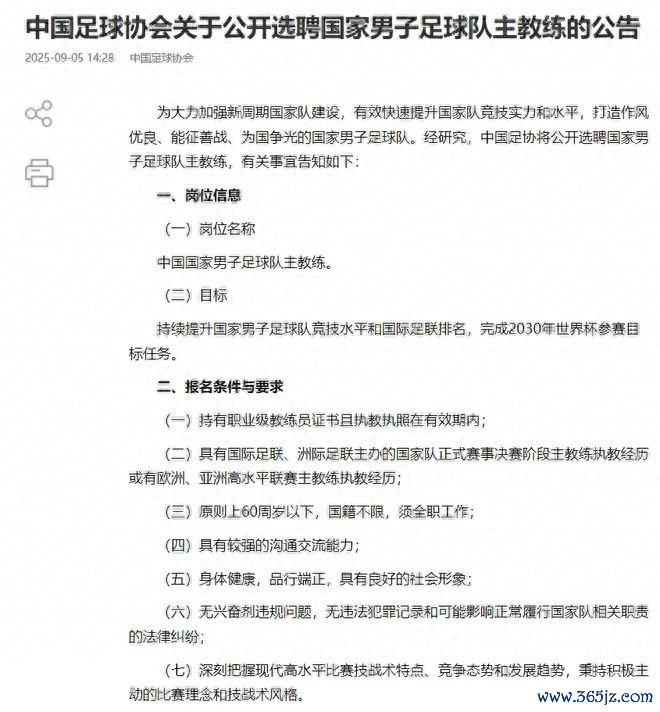 从足协发布这个公告来看,国足新任主帅有几个硬性标准,包括有指导教练员证、身体强健 ,年龄要在60岁以下,同时要有符合国际进步 潮流的技策略 理念,以及国际足联或者洲际足联主办的国家队正式赛事执教经历。