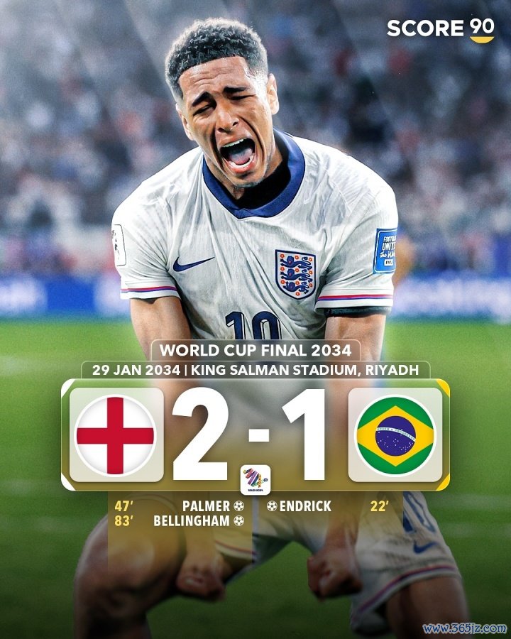 英格兰2-1反转 巴西,恩德里克率先破门,帕尔默扳平比分,贝林厄姆破门完成反转 。