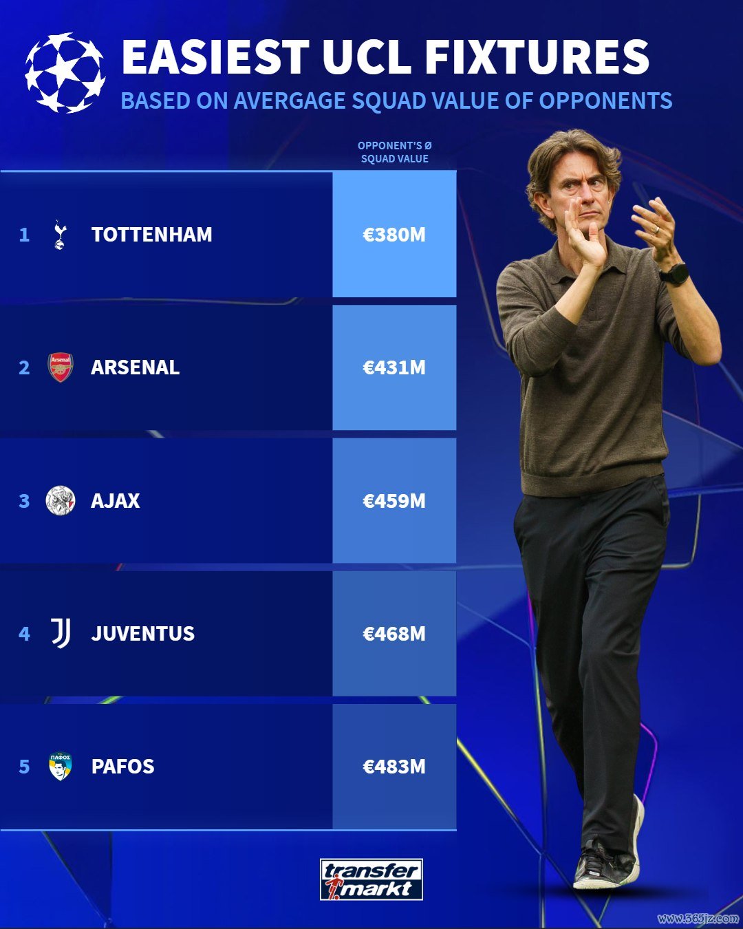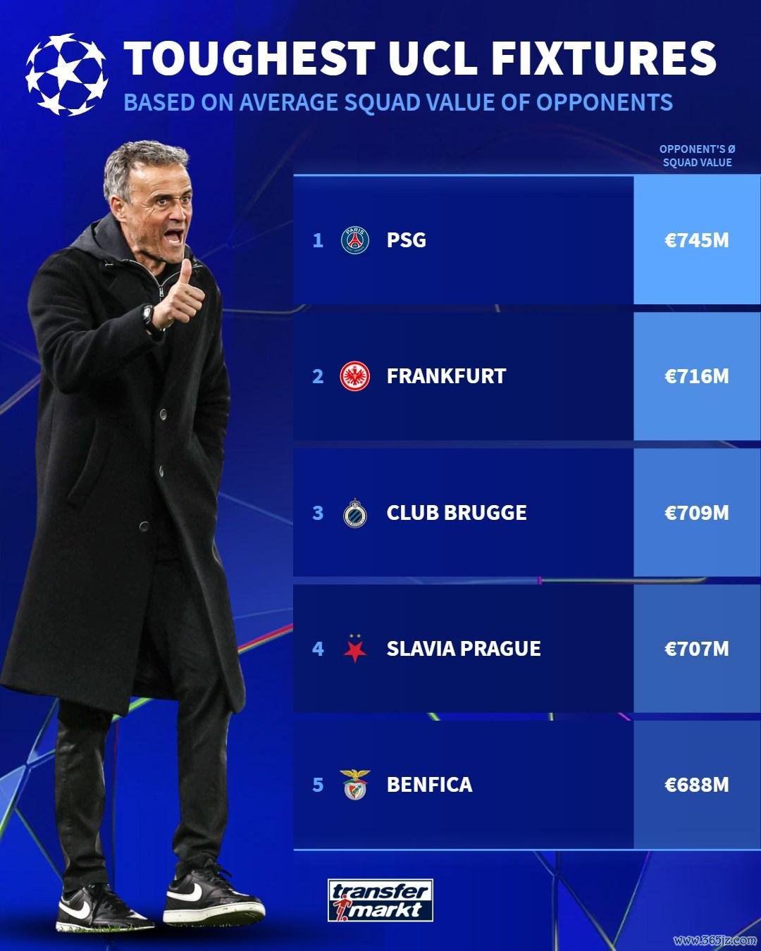 虎扑09月17日讯新赛季的欧冠职业联赛 战火重燃,德国转会市场统计了参赛球队面对对手的平均身价。