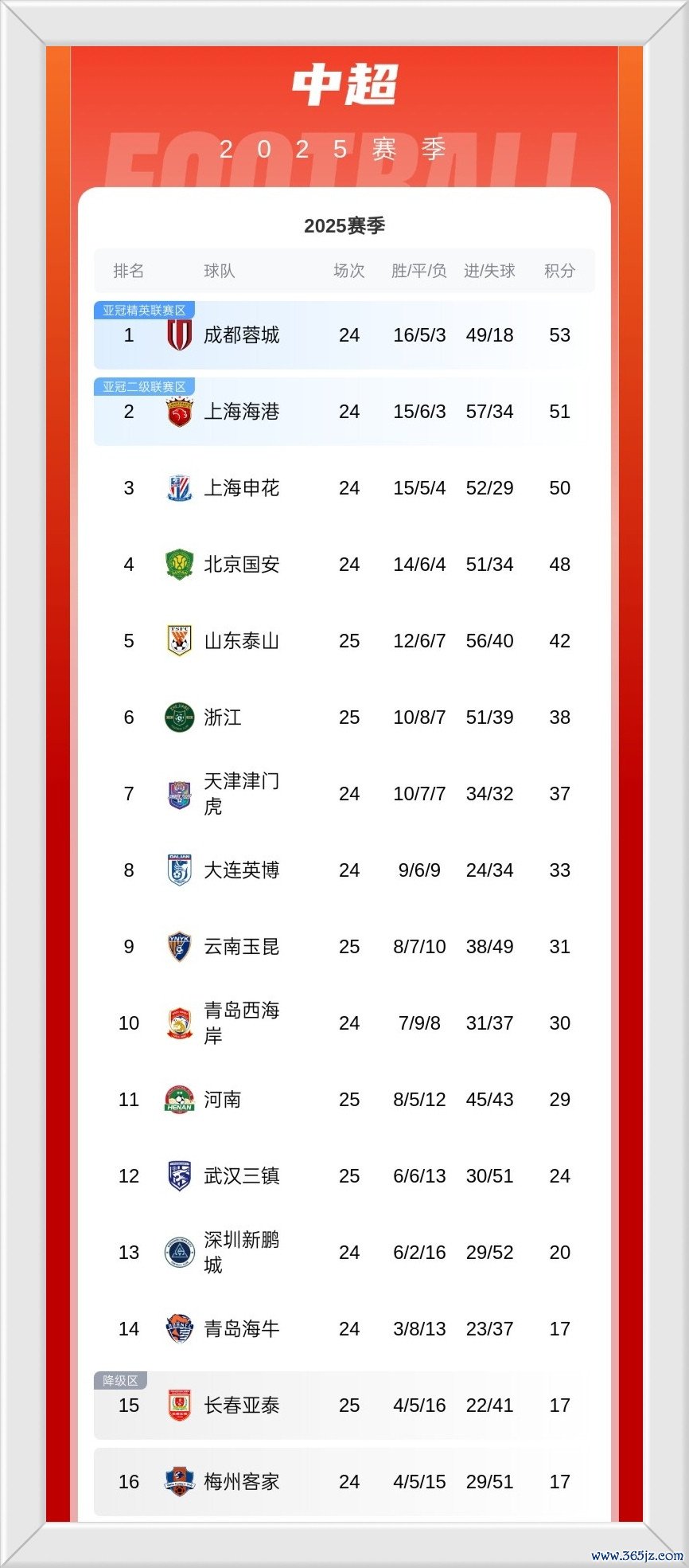 海牛队的1分让其积分来到17分,和长春亚泰队齐平,依靠净胜球优势力压对手,继续排在倒数第三的位置,而亚泰队也依然在降级区深陷其中。