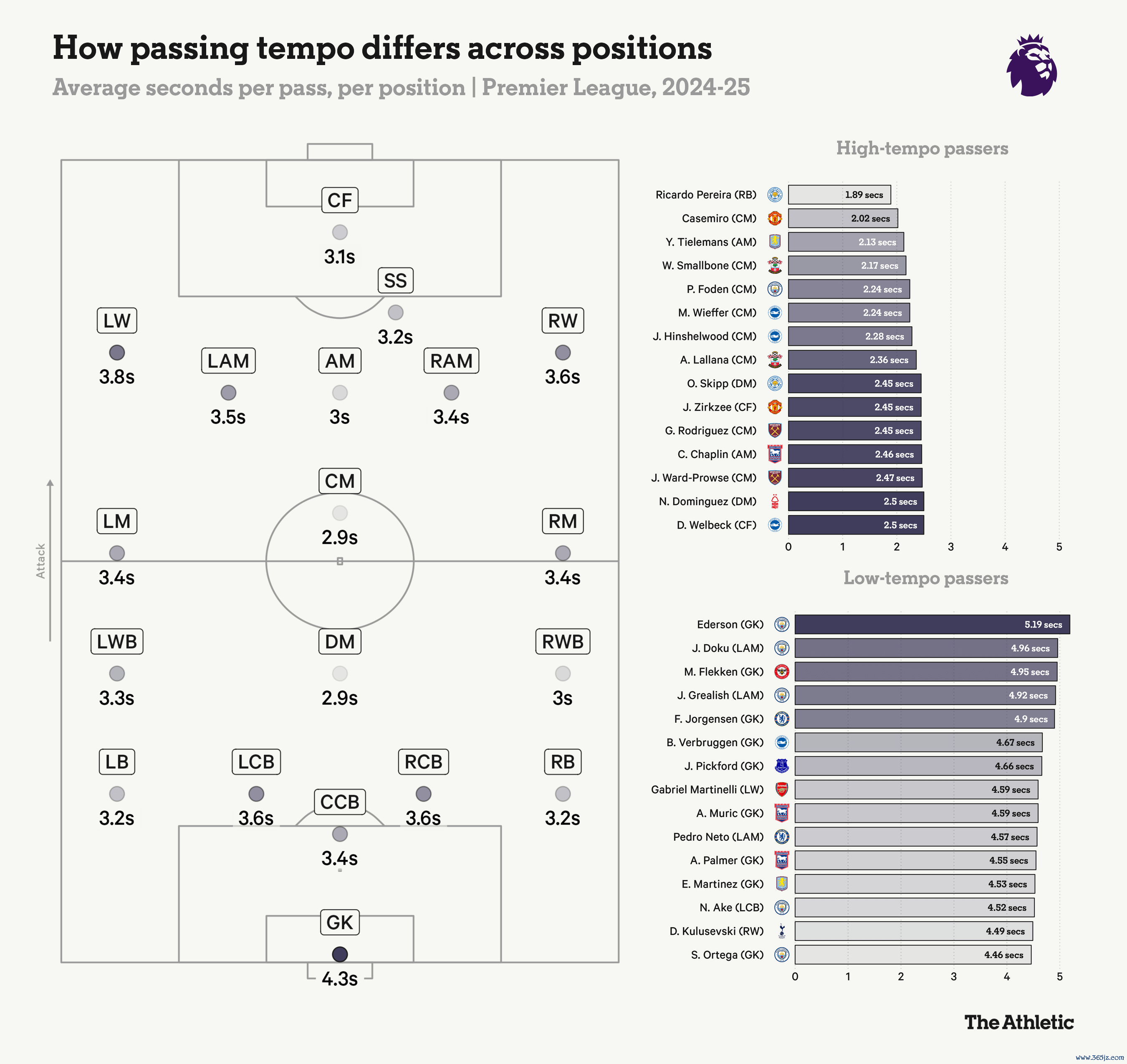 同时,阿森纳和曼城在快速节奏序列的占比中处于最低行列,这与他们希望实施的风格相符。